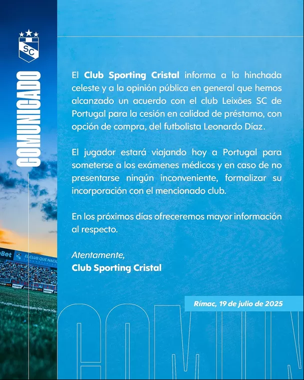 Sporting Cristal continúa con la reestructuración de su plantel de cara al Torneo Clausura de la Liga1 Te Apuesto 2025, y este viernes anunció dos nuevas salidas. A la ya conocida partida de Leonardo Díaz rumbo a Portugal, se suma ahora la transferencia definitiva del extremo argentino Misael Sosa a Godoy Cruz de Argentina, cerrando así su etapa en La Florida tras un paso sin mayor protagonismo.
