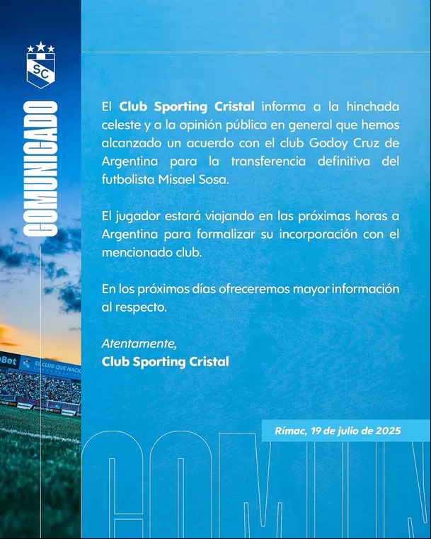 Desde Sporting Cristal también se confirmó la salida del atacante Misael Sosa, quien fue vendido de forma definitiva a Godoy Cruz. “Hemos alcanzado un acuerdo con el club Godoy Cruz de Argentina para la transferencia definitiva del futbolista Misael Sosa”, informó el club a través de sus redes oficiales.