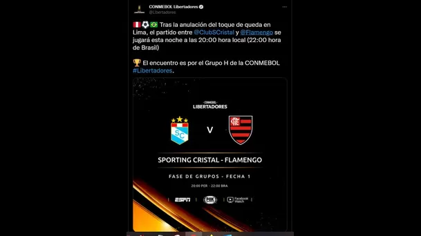"Tras la anulación del toque de queda en Lima, el partido entre Cristal y Flamengo se jugará esta noche a las 20:00 hora local. El encuentro es por el Grupo H de la CONMEBOL Libertadores", hizo oficial la Conmebol a través de sus redes sociales.