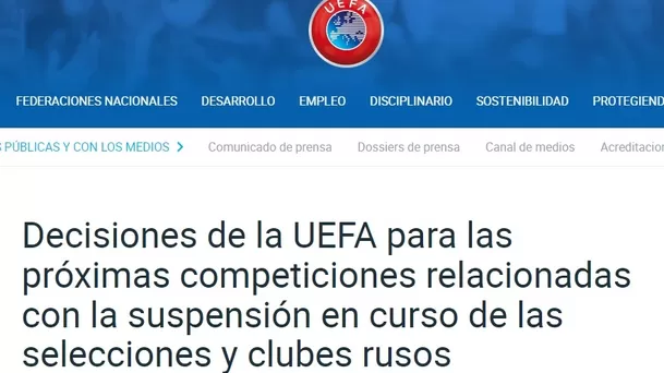 La UEFA emitió un comunicado en el que presenta la nómina de medidas tomadas contra Rusia a raíz de la invasión de Ucrania.