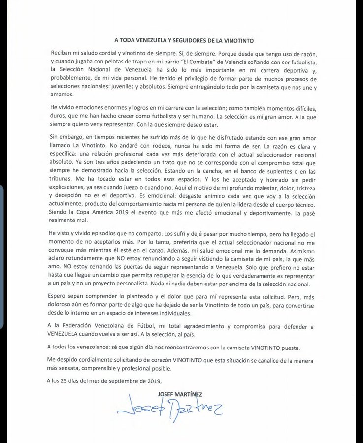 “Espero sepan comprender lo planteado y el dolor que para mí representa esta solicitud. Pero, más doloroso aún es formar parte de algo que ha dejado de ser la Vinotinto de todo un país, para convertirse desde lo interno en un espacio de intereses individuales”, agregó Josef Martínez en su misiva.