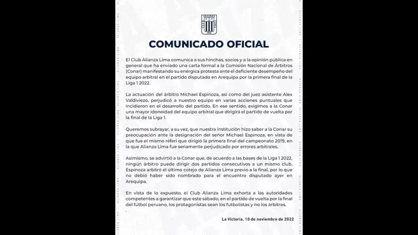"El Club Alianza Lima comunica a sus hinchas, socios y a la opinión pública en general que ha enviado una carta formal a la Comisión Nacional de Árbitros (Conar) manifestando su enérgica protesta ante el deficiente desempeño del equipo arbitralen el partido disputado en Arequipa por la primera final de la Liga 1 2022", indica la publicación.
