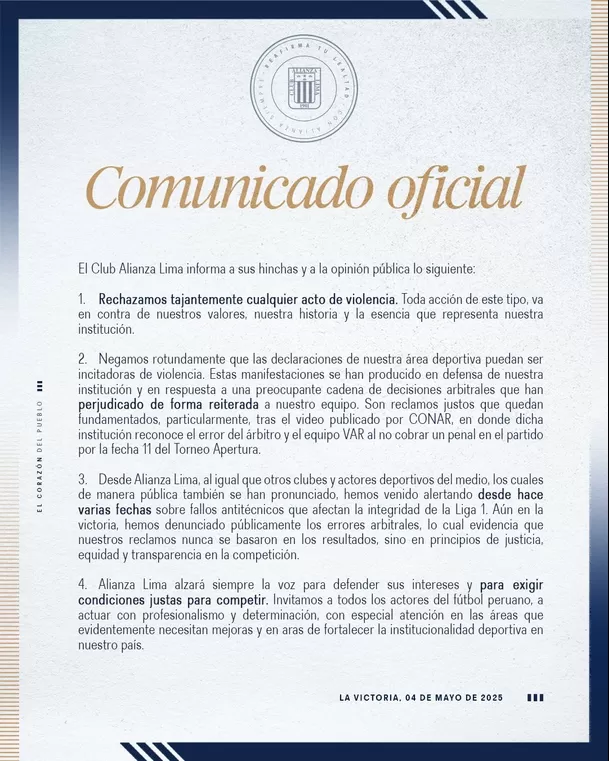 Alianza Lima reafirmó que continuará exigiendo condiciones justas para competir y defenderá sus intereses cada vez que sea necesario. También hizo un llamado a los actores del fútbol peruano para trabajar con profesionalismo y fortalecer la institucionalidad.