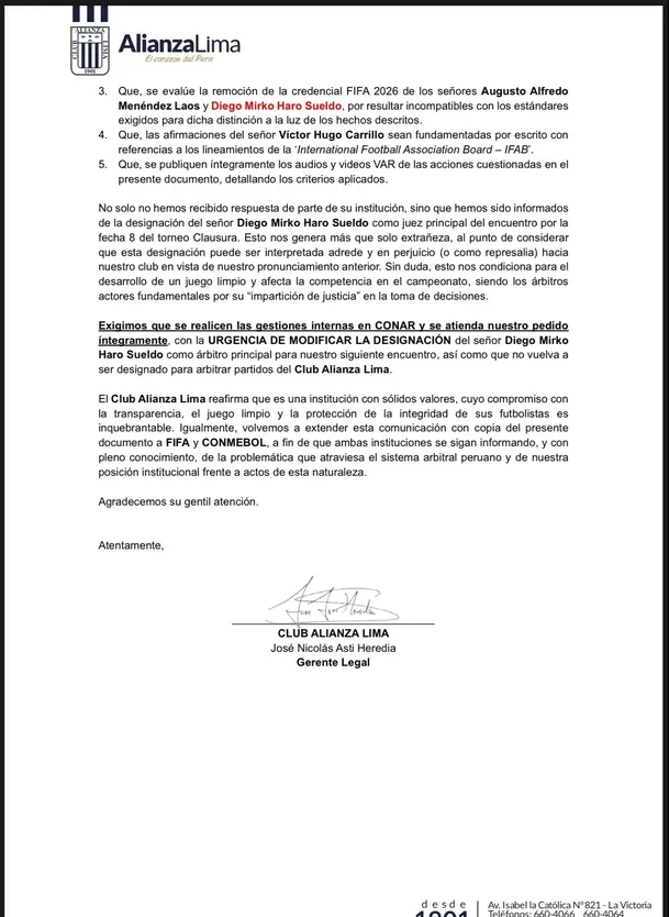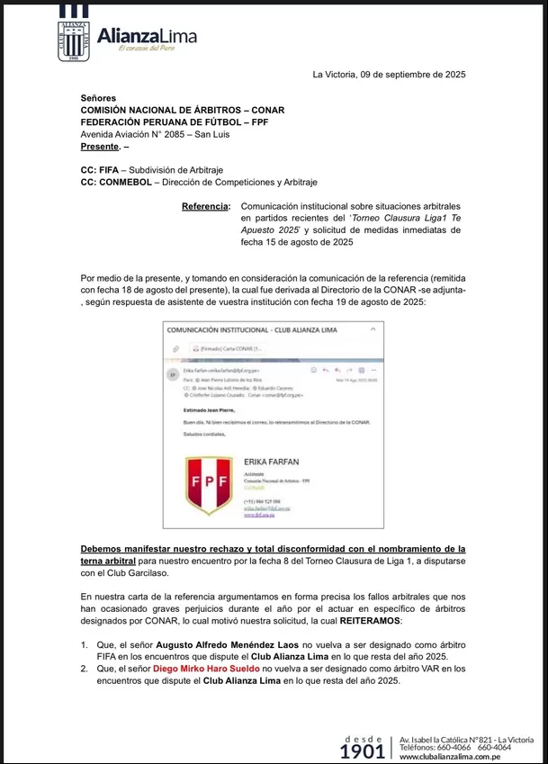 La directiva íntima fue enfática en su pedido hacia la Comisión Nacional de Árbitros (CONAR). “Exigimos que se realicen las gestiones internas en CONAR y se atienda nuestro pedido íntegramente, con la urgencia de modificar la designación del señor Diego Mirko Haro Sueldo como árbitro principal para nuestro siguiente encuentro, así como que no vuelva a ser designado para arbitrar partidos del Club Alianza Lima”, señalaron en el comunicado.