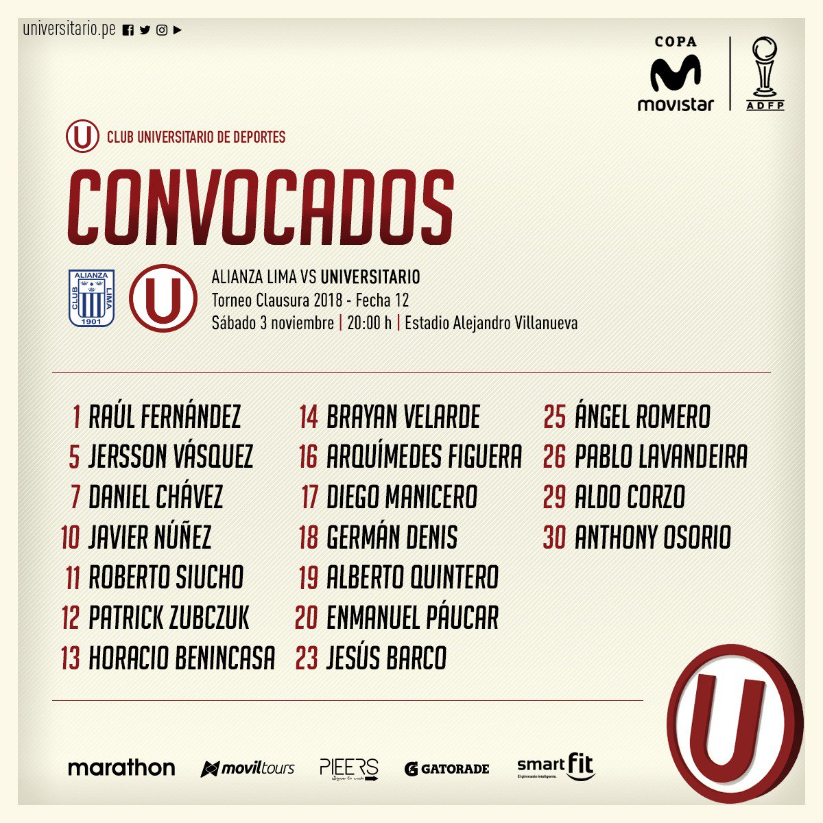 Universitario: Patrick Zubzuck; Aldo Corzo, Ángel Romero, Brayan Velarde, Jersson Vásquez; Enmanuel Páucar, Arquímedes Figuera, Javier Núñez, Alberto Quintero; Roberto Siucho, Germán Denis. DT: Nicolás Córdova