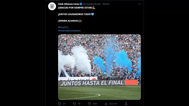 "¡Gracias por siempre estar! ¡Juntos lograremos todo! ¡Arriba Alianza!", publicó Alianza Lima en todas su redes junto a una fotografía de Matute donde se lee: 'Juntos hasta el final'.