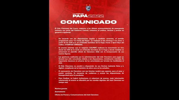 Cienciano comunicó que la 'Tarde del Papá' de llevará a cabo este domingo 9 de enero ante Sport Boys a puertas cerradas desde las 3:00 p.m.
