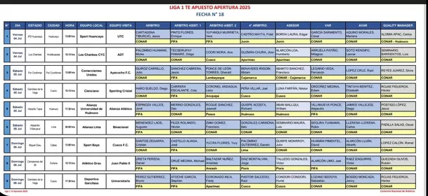 La Comisión Nacional de Árbitros (Conar) dio a conocer la programación oficial de los jueces que impartirán justicia en la fecha 18 del Torneo Apertura de la Liga1 Te Apuesto 2025. En esta jornada decisiva, se jugarán encuentros clave para definir al campeón del certamen, con Universitario de Deportes, Alianza Lima y Alianza Atlético peleando punto a punto por el título.