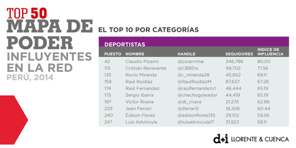 Dentro del Mapa de Poder – TOP 50 Influyentes en la Red del Perú, que realiza la consultara de comunicaciones Llorente & Cuenca, que acompaña a la tradicional Encuesta de Poder, también aparecen deportistas.