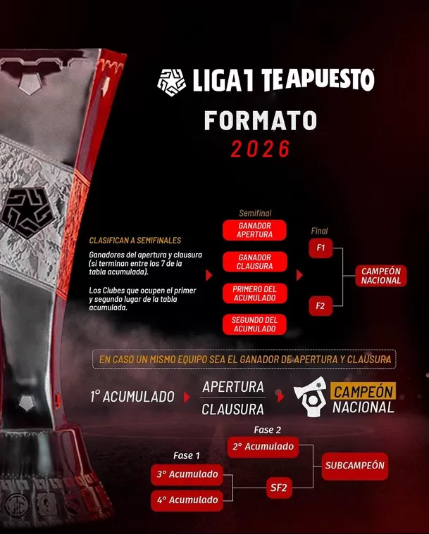 La definición del campeón de la Liga 1 2026 se resolverá mediante una fase final de eliminación directa. Clasificarán los ganadores del Apertura y Clausura, siempre que terminen entre los siete primeros de la tabla acumulada, además de los dos mejores ubicados de la clasificación general. Con estos cuatro equipos se conformarán las llaves de semifinales.