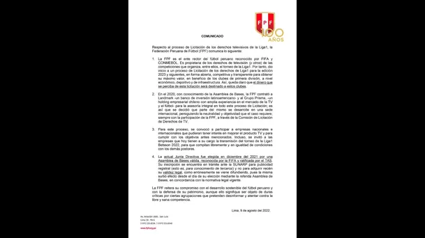 La Federación Peruana de Fútbol emitió un comunicado a raíz de la licitación de los derechos televisivos de la Liga 1 para los próximos años.