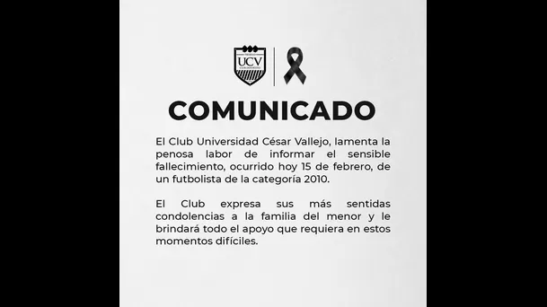 "El Club Universidad César Vallejo, lamenta la penosa labor de informar el sensible fallecimiento, ocurrido hoy 15 de febrero, de un futbolista de la categoría 2010", indica el comunicado.