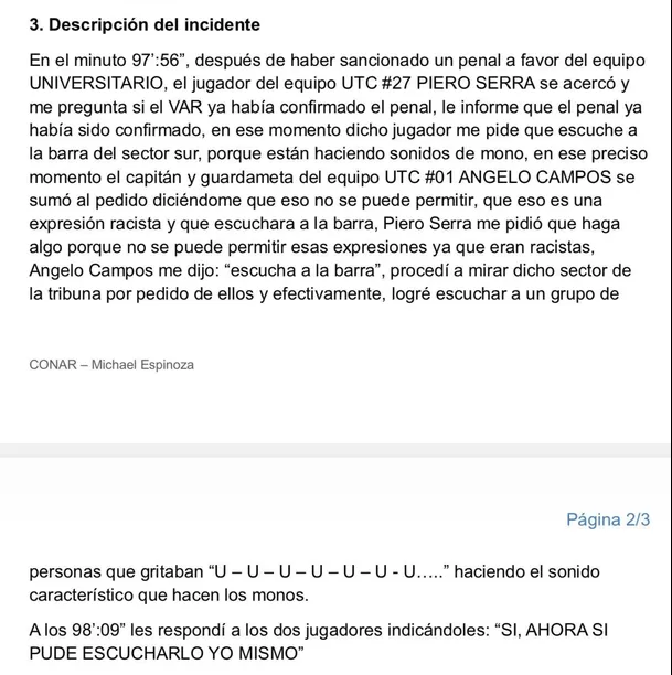 “Procedí a mirar a dicho sector de la tribuna por pedido de ellos (Ángelo Campos y Piero Serra) y, efectivamente, logré escuchar a un grupo de personas que gritaban haciendo el sonido característico que hacen los monos”, precisó el árbitro FIFA. El episodio ocurrió mientras Alex Valera se preparaba para ejecutar el disparo desde los doce pasos, acción que terminó sellando el 2-0 a favor de Universitario.