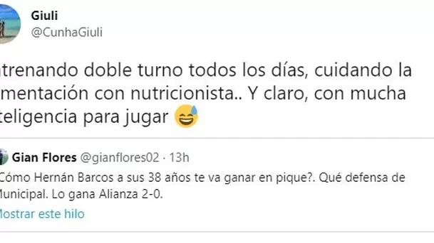 "¿Cómo Hernán Barcos a sus 38 años te va ganar en pique? Qué defensa de Municipal", escribió @gianflores02, situación que generó la reacción de Giuli Cunha, esposa del jugador del elenco victoriano.