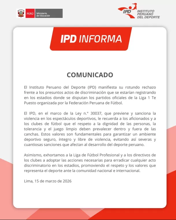 "El Instituto Peruano del Deporte (IPD) manifiesta su rotundo rechazo frente a los presuntos actos de discriminación que se estarían registrando en los estadios donde se disputan los partidos oficiales de la Liga 1 Te Puesto organizada por la Federación Peruana de Fútbol", colocaron.