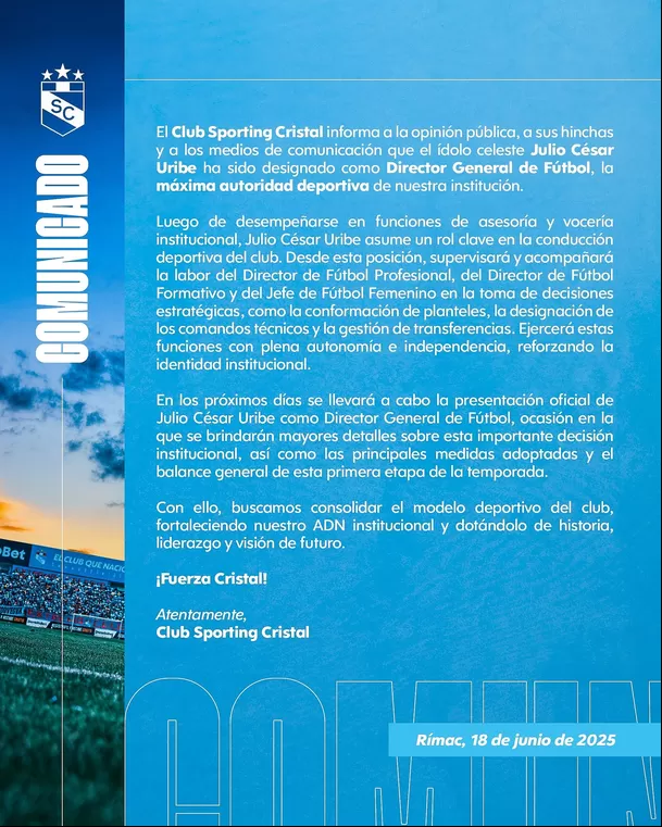 “El Club Sporting Cristal informa que el ídolo celeste Julio César Uribe ha sido designado como Director General de Fútbol, la máxima autoridad deportiva de nuestra institución”, señala el anuncio. Esta decisión marca un nuevo capítulo en la estructura de mando del equipo rimense, buscando consolidar su modelo deportivo y reforzar su identidad institucional.