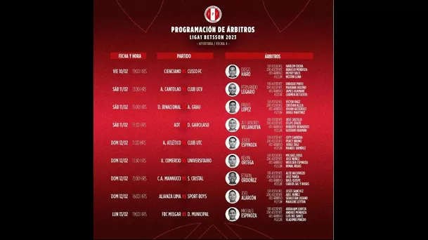 Mientras que el duelo, también el domingo, entre Sporting Cristal y Carlos A. Mannucci en el Mansiche de Trujillo será pitado por Edwin Ordoñez desde las 3:00 p.m.