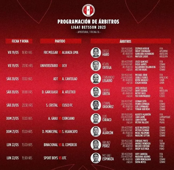 Alianza Lima levantará el telón de la jornada en su visita a Melgar en Arequipa el 19 de mayo desde las 6:30 p.m.,el árbitro designado para este compromiso es Diego Haro, como primer asistente estará Stephen Atoche y como segundo asistente Fredy Coronado.