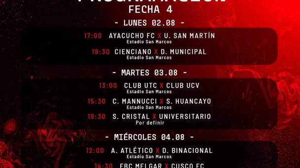 Sin embargo, el plato fuerte de esta fecha será el Sporting Cristal vs. Universitario a dispustarse este martes 3 de agosto desde las 7:30 p.m. en el Estadio Nacional.