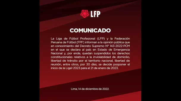"La Liga de Fútbol Profesional y la Federación Peruana de Fútbol informan a la opinión pública que en conoocimiento del Decreto Supremo N° 143-2022-PCM en el que se se declara al país en Estado de Emergencia Nacional y, por ende, quedan suspendidos los derechos constituciones relativos a la inviolabilidad de domicilio, libertad de tránsito por el territorio nacional, libertad de reunión, entre otros, por 30 días, se decide posponer el inicio de la Liga 1 2023 para el 21 de enero de 2023", señala el comunicado de la LFP.