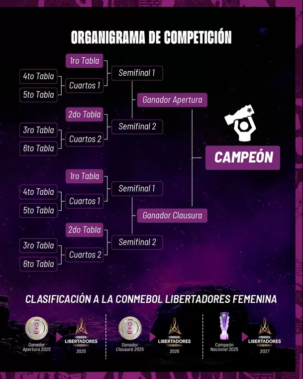 Este 2025, la Liga Femenina adoptará un nuevo formato con dos torneos: Apertura y Clausura. La gran novedad es que cada campeón asegurará su clasificación a la Copa Libertadores, con el ganador del Apertura obteniendo su boleto para la edición 2025 y el del Clausura para la de 2026.