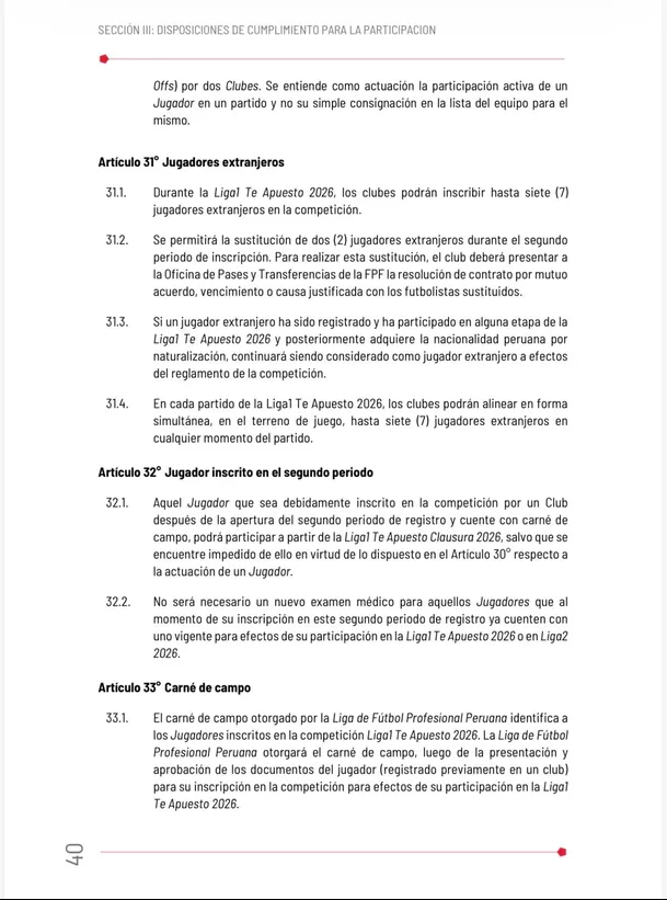 "Durante la Liga 1 Te Apuesto 2026, los clubes podrán inscribir hasta siete jugadores extranjeros en la competición. Se permitirá la sustitución de dos jugadores extranjeros durante el segundo periodo de inscripción. Para realizar esta sustitución, el club deberá presentar a la Oficina de Pases y Transferencias de la FPF la resolución de contrato por mutuo acuerdo, vencimiento o causa justificada con los futbolistas sustituidos", se lee en el documento.