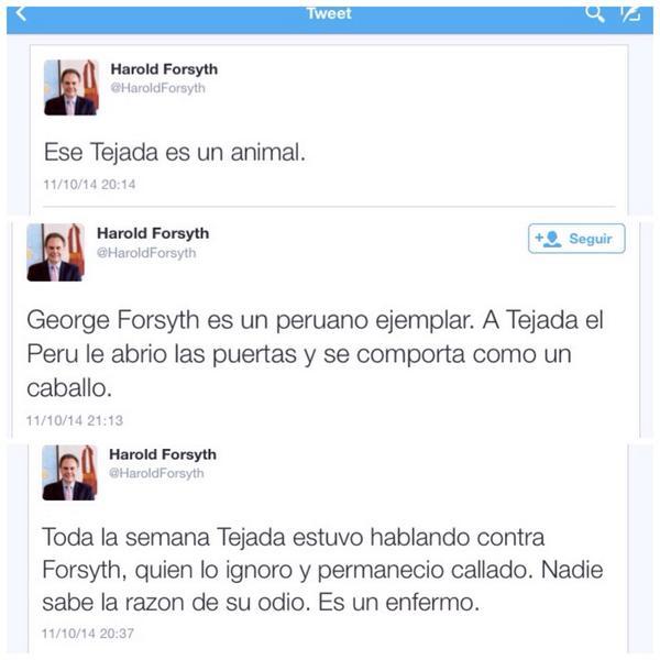 “Ese Tejada es un animal. Toda la semana estuvo hablando contra Forsyth, quien lo ignoró y permaneció callado. Nadie sabe la razón de su odio. Es un enfermo”, fue el mensaje de Harold Forsyth, quien luego borró los tuits, aunque estos fueron guardados por usuarios.