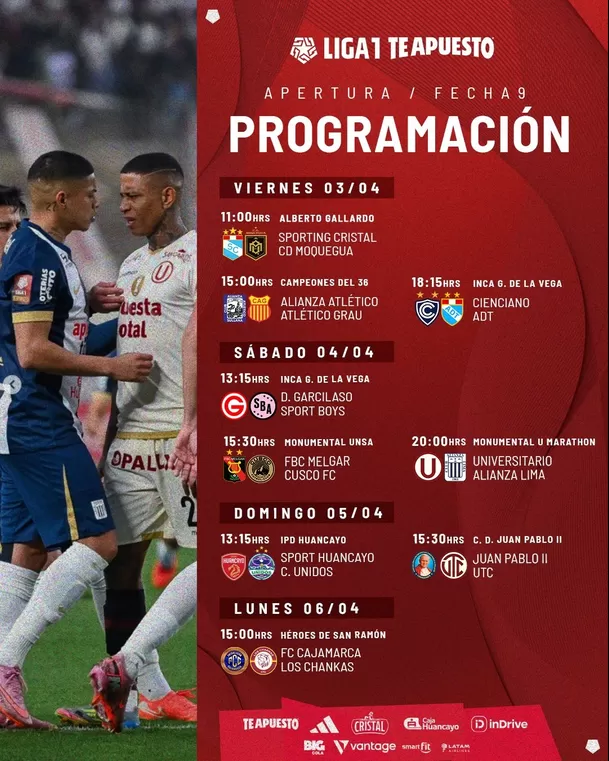 La Liga1 Te Apuesto 2026 continúa su curso y ya quedó definida la programación de la fecha 9 del Torneo Apertura, que se disputará del viernes 3 al lunes 6 de abril en distintos escenarios del país. La jornada no solo presenta duelos clave en la tabla, sino que tiene como principal atractivo una nueva edición del clásico del fútbol peruano entre Universitario de Deportes y Alianza Lima.
