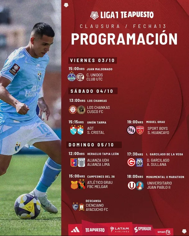 El Torneo Clausura 2025 de la Liga1 Te Apuesto ingresa en su recta final con la disputa de la fecha 13, que se jugará entre el viernes 3 y el domingo 5 de octubre. La jornada promete ser determinante tanto en la pelea por el título como en la lucha por la permanencia y clasificación a torneos internacionales.