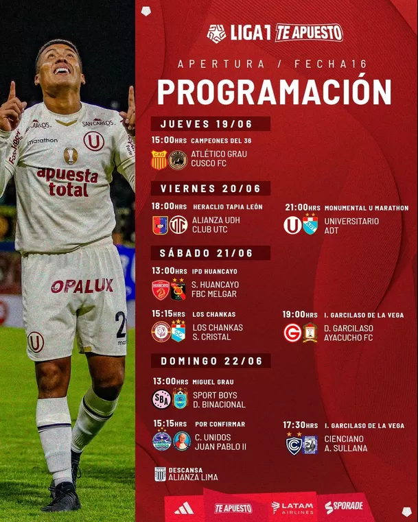 La Liga1 continúa con la antepenúltima jornada del Torneo Apertura 2025, que arranca este jueves 19 de junio y va hasta el domingo 22. Alianza Lima le toca descansar en esta fecha 16.