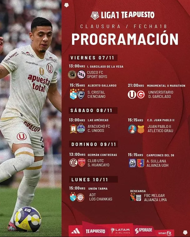 Aunque Universitario de Deportes ya se consagró tricampeón del fútbol peruano tras ganar el Torneo Clausura 2025 de la Liga1 Te Apuesto, la competencia continúa con la programación de la fecha 18, que se jugará desde el viernes 7 hasta el lunes 10 de noviembre. Esta penúltima jornada mantiene la expectativa en torno a los cupos internacionales y la lucha por evitar el descenso.