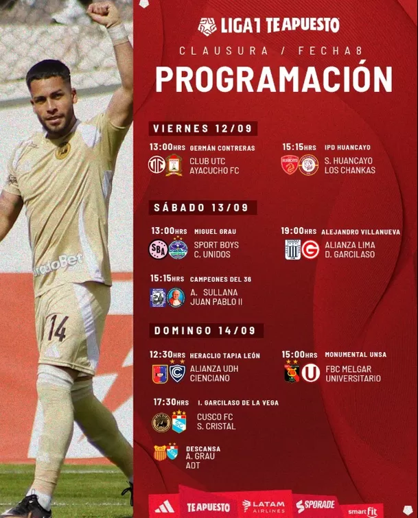 Vuelve la Liga1 Te Apuesto tras el receso de las Eliminatorias al Mundial 2026. Los 18 equipos que hoy por hoy confirman la Liga vuelven a poner todas sus fichas en lo que será la octava jornada del Torneo Clausura 2025 que arranca este viernes 12 y va hasta el domingo 14 de septiembre.