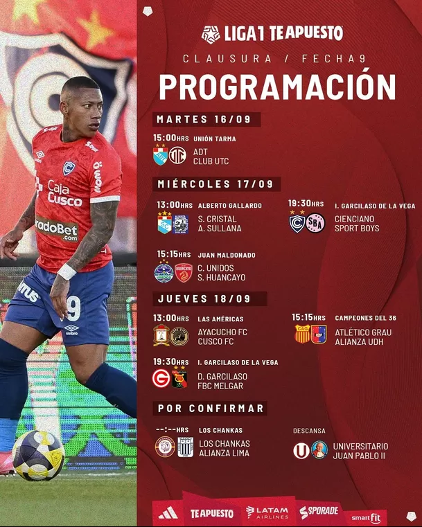La novena jornada del Torneo Clausura de la Liga1 Te Apuesto 2025 se disputará del martes 16 al jueves 18 de septiembre y tendrá como partido más atractivo el choque entre Deportivo Garcilaso y Melgar en Cusco.