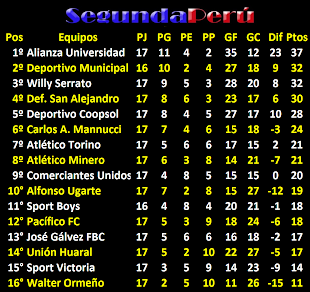 Se jugó la jornada 17 de la Segunda División, donde Alianza Universidad se mantiene como único líder del certamen con 37 puntos, luego de golear a José Gálvez. Willy Serrtato cayó y quedó a 5 puntos. Municipal también llega con 32 unidades, pero con un partido menos.
