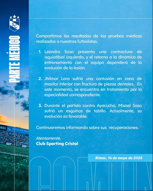 A estas dos bajas se suma la del atacante Misael Sosa, quien se lesionó en el duelo anterior ante Ayacucho FC. El informe médico de Sporting Cristal reveló que el delantero uruguayo sufrió un esguince de tobillo, aunque se encuentra en proceso de recuperación favorable. Sin embargo, desde el club no quieren forzar su retorno.