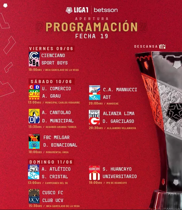 El Torneo Apertura de la Liga 1 - 2023 acabará este fin de semana. Entre hoy viernes 9 y el domingo 11 de junio se jugará la fecha 19 (la última) del certamen que ganó Alianza Lima, que buscará seguir sumando puntos pensando en la tabla del puntaje acumulado.