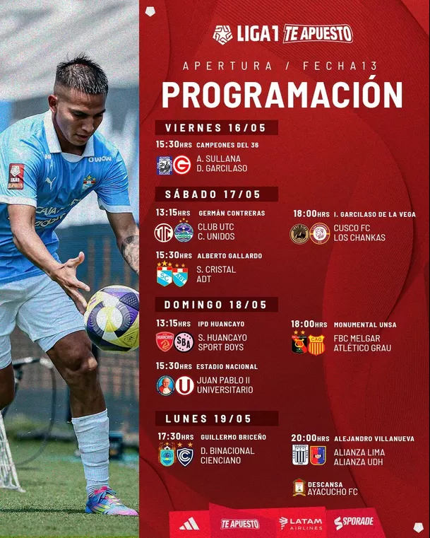 El Torneo Apertura retorna tras la jornada de Copa Libertadores y Sudamericana, desarrollándose la fecha 13 de la Liga1 Te Apuesto 2025 que entra a su recta final. Los partidos se jugarán desde este viernes 16 de mayo y va hasta el lunes 19.