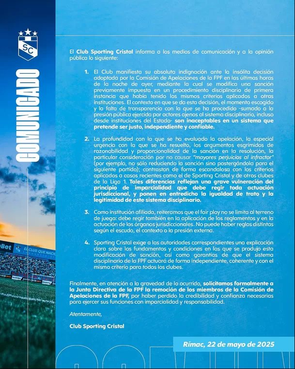 El club celeste denunció que la modificación de la sanción se dio en un contexto poco transparente, con presión externa y en horarios inusuales, lo que a su juicio vulnera la credibilidad del sistema disciplinario. Además, advirtió que la actuación de la Comisión de Apelaciones contradice los principios de imparcialidad y equidad que deben regir las decisiones en el fútbol profesional peruano.