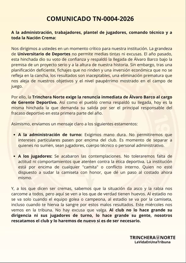 Uno de los puntos más fuertes del pronunciamiento es el pedido explícito hacia la gerencia deportiva: “la Trinchera Norte exige la renuncia inmediata de Álvaro Barco al cargo de Gerente Deportivo”. La barra considera que es el principal responsable del momento actual, al que califican como un “fracaso deportivo en esta primera parte del año”.
