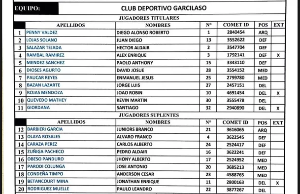 En tanto, Garcilaso, dirigido por Jorge Célico, formará con Diego Penny, Juan Diego Lojas, Héctor Salazar, Alex Rambal, Paolo Méndez, David Dioses, Enmanuel Paúcar, Jorge Bazán, Joao Rojas, Kevin Quevedo y Santiago Giordana.