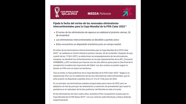 El máximo organismo futbolístico mundial aprovechará que a partir de las 11:00 a.m. (hora peruana) tendrá lugar el sorteo de los emparejamientos de las eliminatorias europeas para, a continuación, definir los enfrentamientos en los que los representantes de Asia (AFC), Concacaf, Conmebol y Oceanía (OFC) definirán los dos últimos boletos para la fase final.