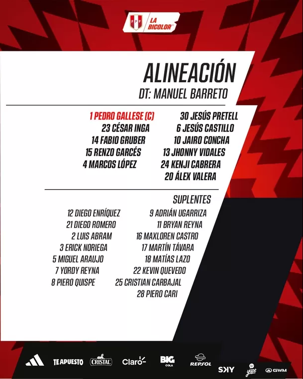 Así formará Perú: Pedro Gallese; César Inga, Fabio Gruber, Renzo Garcés, Marcos López; Jesús Pretell, Jesús Castillo, Jairo Concha; Jhonny Vidales, Kenji Cabrera y Alex Valera.