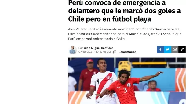 "Perú convocó de emergenia a delantero que le marcó dos goles a Chile en fútbol playa", tituló el portal chileno red gol.