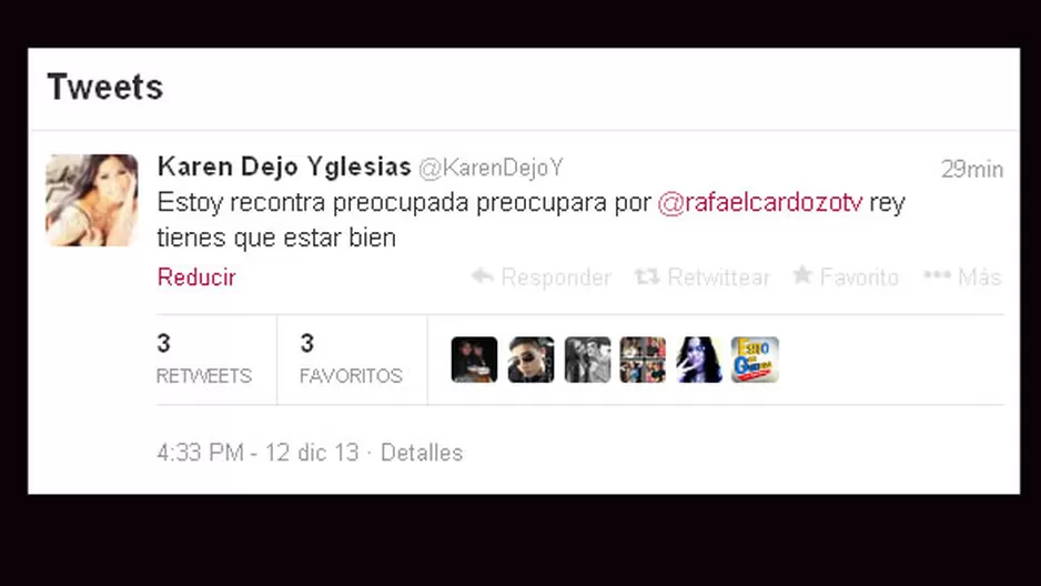 La morocha Karen Dejo publicó en cuenta de twitter lo siguiente: "Estoy recontra precoupada por Rafel Cardozo, rey estoy recontra preocupada".