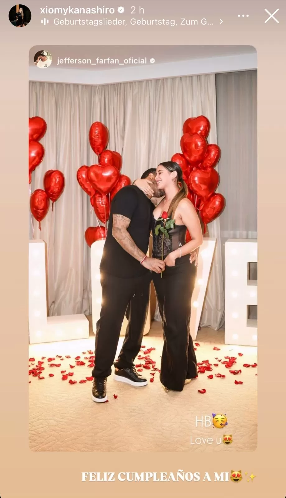 Jefferson Farfán se lució muy enamorado de Xiomy Kanashiro y no dudó en preparar un romántico detalle que compartió a través de sus redes sociales. El exfutbolista compartió una fotografía cuando sorprendió a la bailarina con varios globos en forma de corazón y de color rojo, letras gigantes que se lee la palabra "love" y una rosa roja mientras le daba un beso en el cuello.