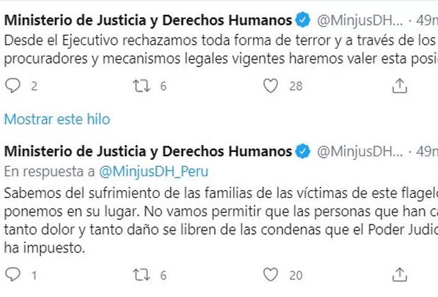 “En el MinjusDH somos conscientes de las secuelas del terrorismo, tenemos programas de reparación en el Viceministerio de Derechos Humanos y sabemos del dolor de todas las familias. Nos ponemos en su lugar y estamos de su lado para que personas que han cometido tanto daño en nuestro país no se libren de las condenas que el sistema judicial ha impuesto”, enfatizó.