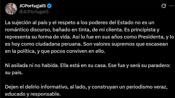 El abogado Portugal afirmó de forma directa que “ella está en su casa; ese fue y será su paradero, su país”. Con estas palabras intentó disipar dudas que surgieron desde la vacancia de Boluarte, debido a que no se conocía oficialmente su ubicación.