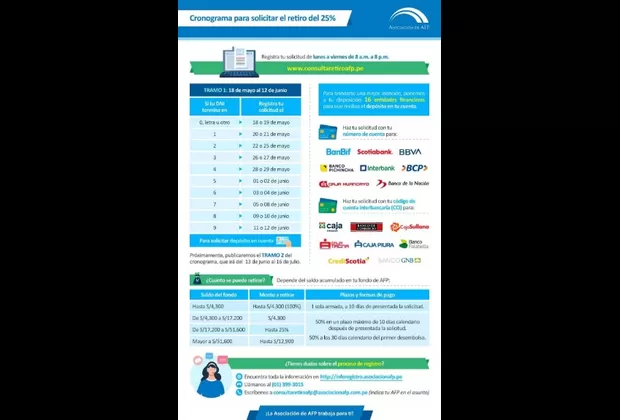 Una vez que ingrese al portal elija la opción del 25 % y digite su nombre, DNI y número de teléfono, pasando luego a elegir hasta cuánto desea retirar y en qué institución financiera desea que se depositen sus recursos. Después de diez días calendario se le abonará la totalidad de la suma solicitada o la primera parte de esta, según sea el caso.