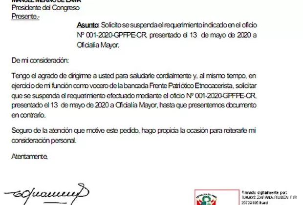 En el documento, Alarcón Tejada sostiene: "en ejercicio de mi función como vocero de la bancada Frente Patriótico Etnocacerista, solicito que se suspenda el requerimiento efectuado mediante el oficio N° 001-2020-GPFPE-CR, presentado el 13 de mayo de 2020 a Oficialía Mayor, hasta que presentemos documento en contrario".