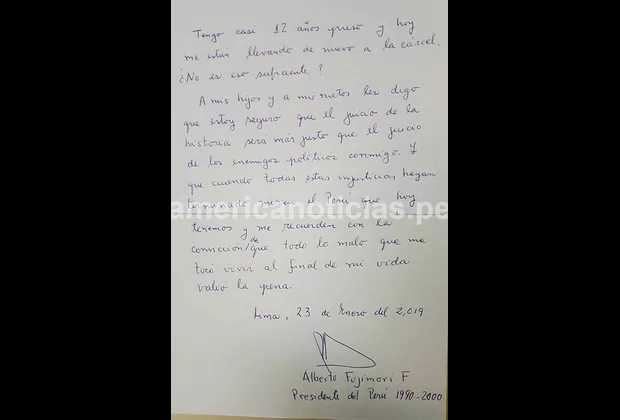 El expresidente de la República, Alberto Fujimori, envió una carta a la AFP la tarde de este miércoles antes de volver a prisión en el que aseguró que su final "está cerca", tras la decisión del Poder Judicial de revocarle el indulto que le concedió el exmandatario Pedro Pablo Kuczynski.